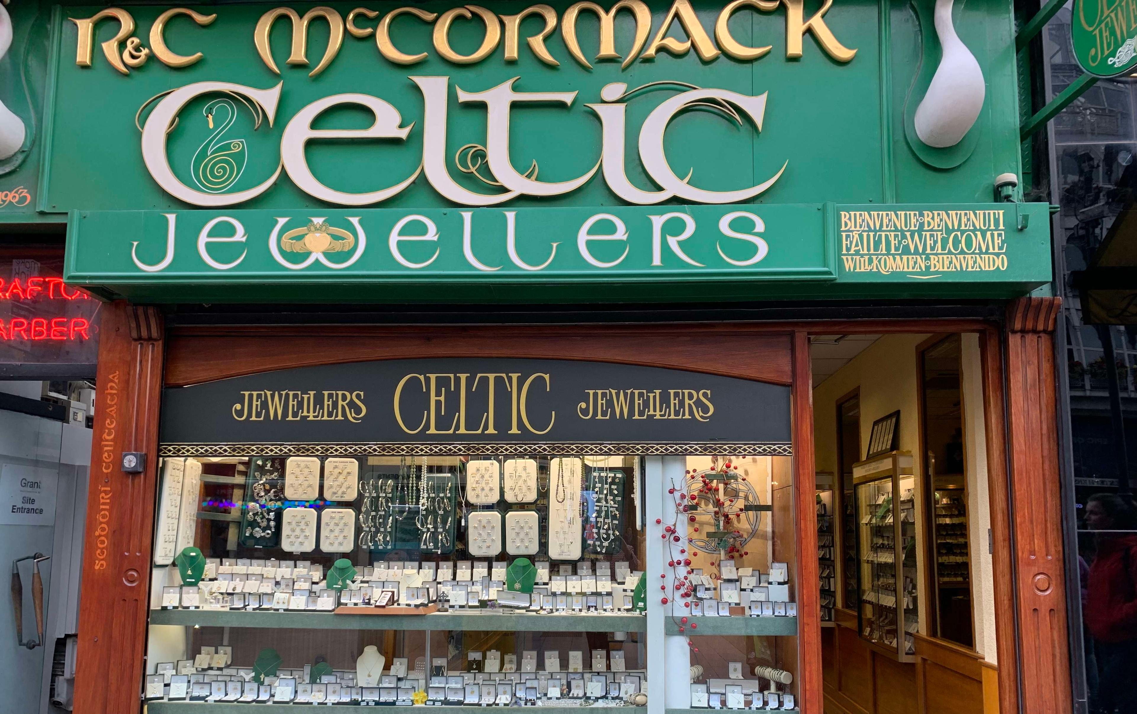 R & C McCormack is an Irish family-run shop that has been selling the finest Celtic jewellery on Dublin’s Grafton Street since 1963. They pride ourselves on having the finest selection of silver and gold Celtic Irish jewellery. Beautiful Claddagh rings and Celtic knot-work pieces inspired from the Book of Kells, are among many designs for you to enjoy at R & C McCormack. Their distinctive shopfront on Grafton Street has become a Dublin landmark.