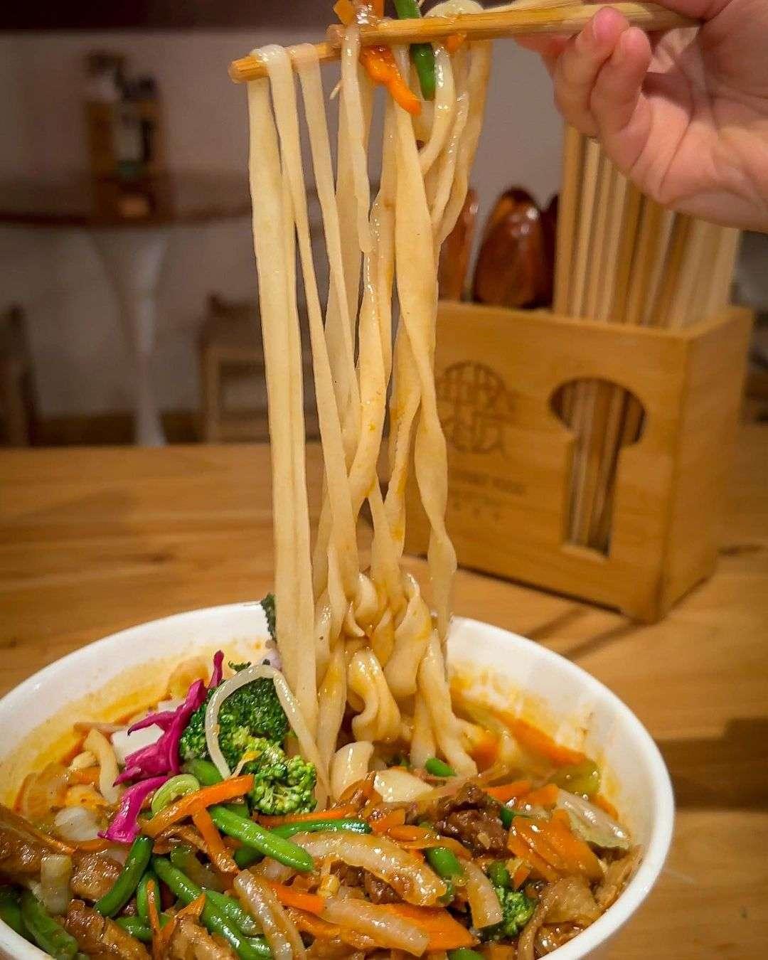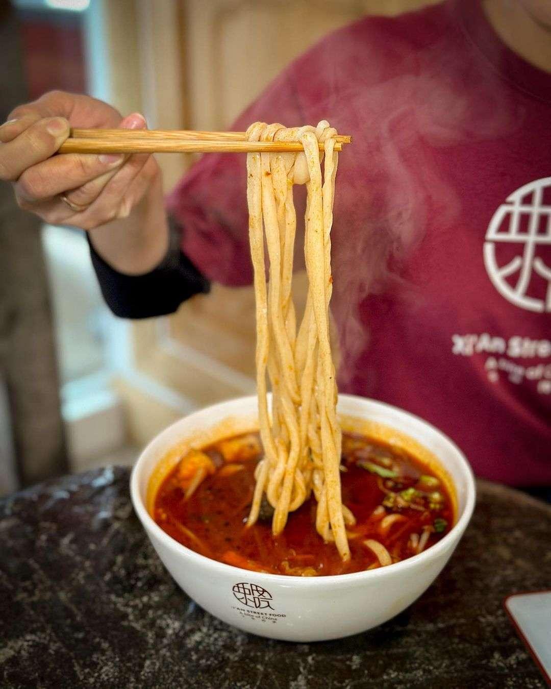 Their menu includes the Xi’An meat buger (or, Roujiamo), which is like a hamburger, but with a much longer history. Lean pork is braised for hours – then hand-shredded and finally pocketed in the bread – we’re hungry just thinking about it. Xi’An Street Food’s signature dish, and arguably their most popular, is the Biang Biang noodle dish.